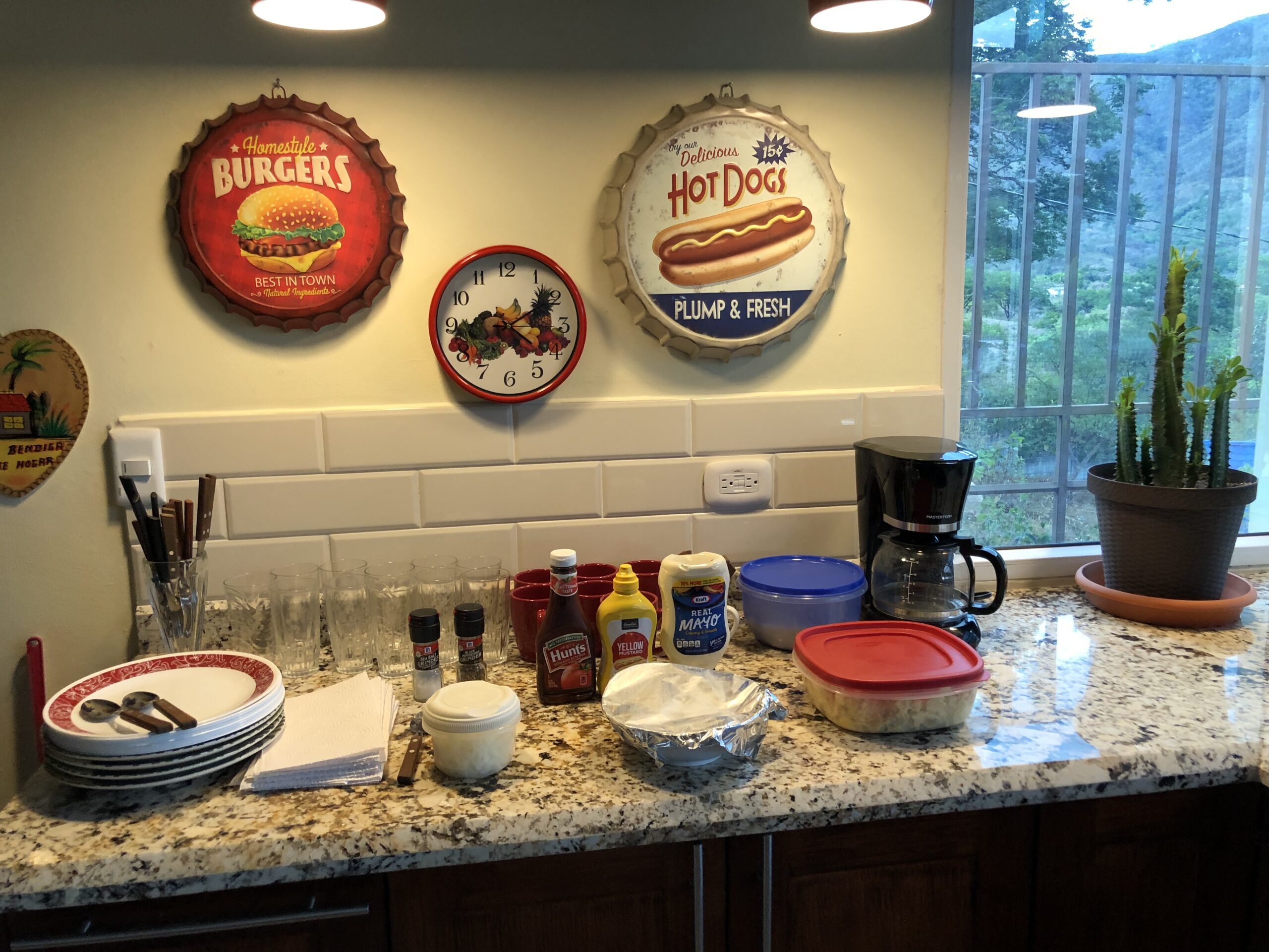 La foto de arriba muestra mi cocina lista para que los invitados disfruten de los acompañamientos para hot dogs y hamburguesas en la terraza. Mi casa, ubicada en la ladera de una montaña, se llama “La Casa de las Cuatro Mártires”, en honor a cuatro misioneras católicas estadounidenses que fueron martirizadas en El Salvador el 2 de diciembre de 1980.